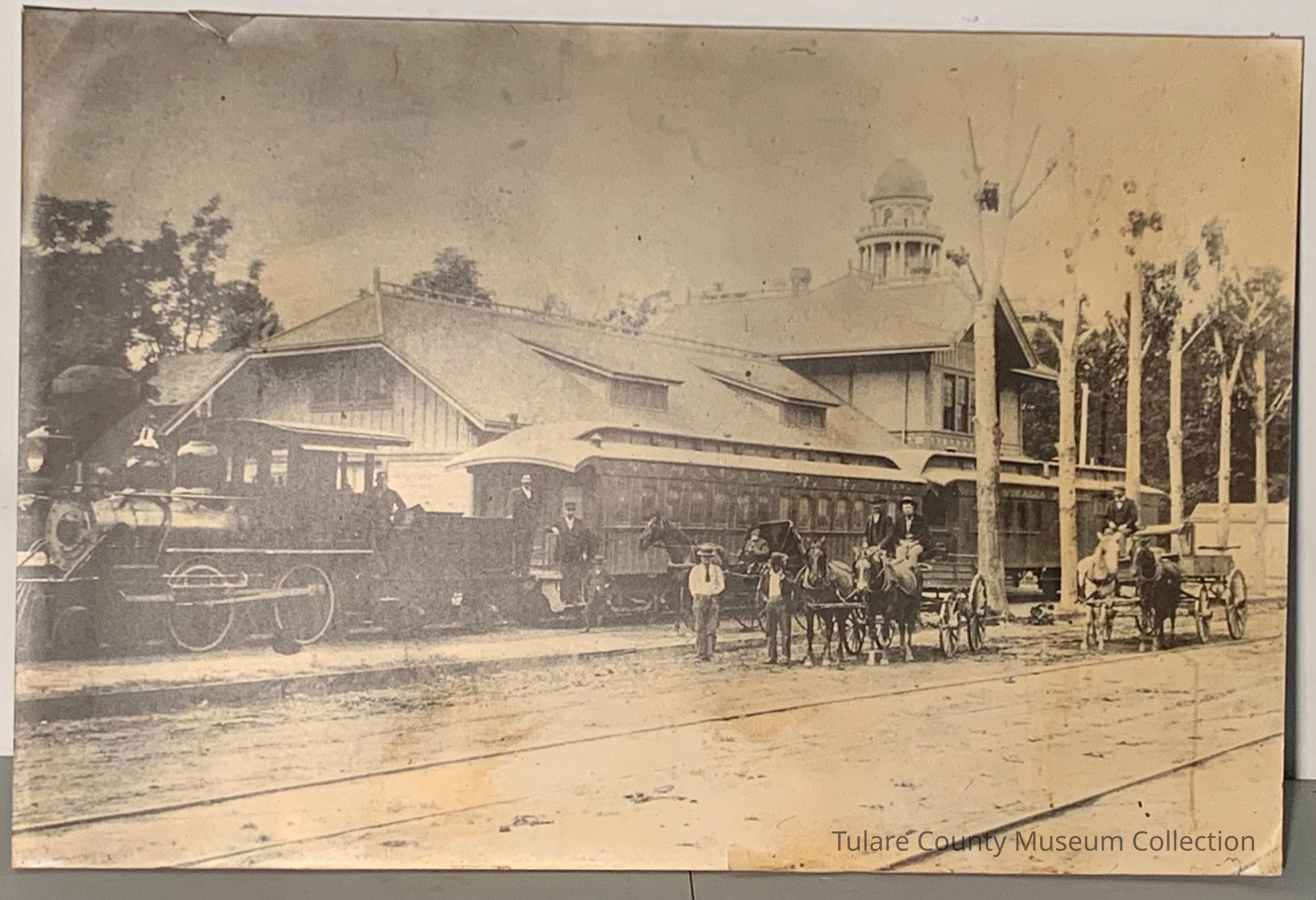 Photograph of horse carriage in front of train that is stationed outside of house/or train station.