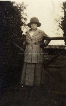 Portrait- Young Woman. Standing in front of a gate, with a field and a fence in the back ground.She is wearing striped jacket and long skirt, with boots, gloves and a hat. Circa 1900 - 1920. Same as #2077 Type: Paper