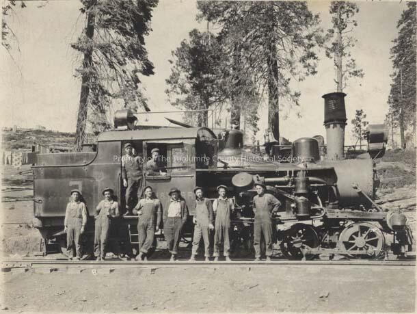 The following standing along side of locomotive. #1. Otis Kerr; #2.Roy Wright #;3.Merle Roberts; #4.Johnny Smith; #5.Swede Hallan; #6."Brownie" Rosier; IN CAB- #1."Punk" Albers #2."Shorty" Leland Maddox; Far Right of photo Ernest Gianelli.