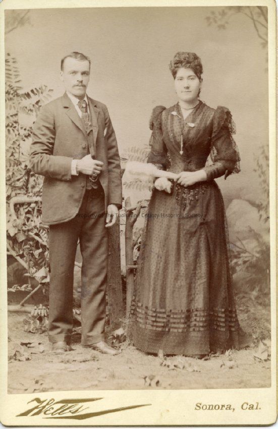 A black and white portrait of an unidentified man and lady. Lady is wearing long dress with puffed sleeves with lace and lace around bottom. Her hair is up and she s wearing a necklace. Man is wearing suit and tie and has short hair.