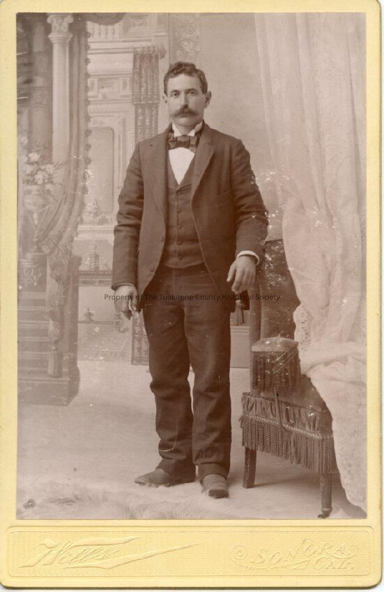 A black and white portrait of an unidentified man wearing suit and bow tie, has dark hair with side part, mustache. He is standing beside a chair with fringe and has arm resting on it.