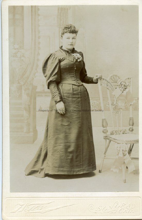 A black and white portrait of an unidentified Lady wearing long dress with puff sleeves and buttons down front. Hair is worn up with curls. She is standing by a ornate chair and has hand resting on back.