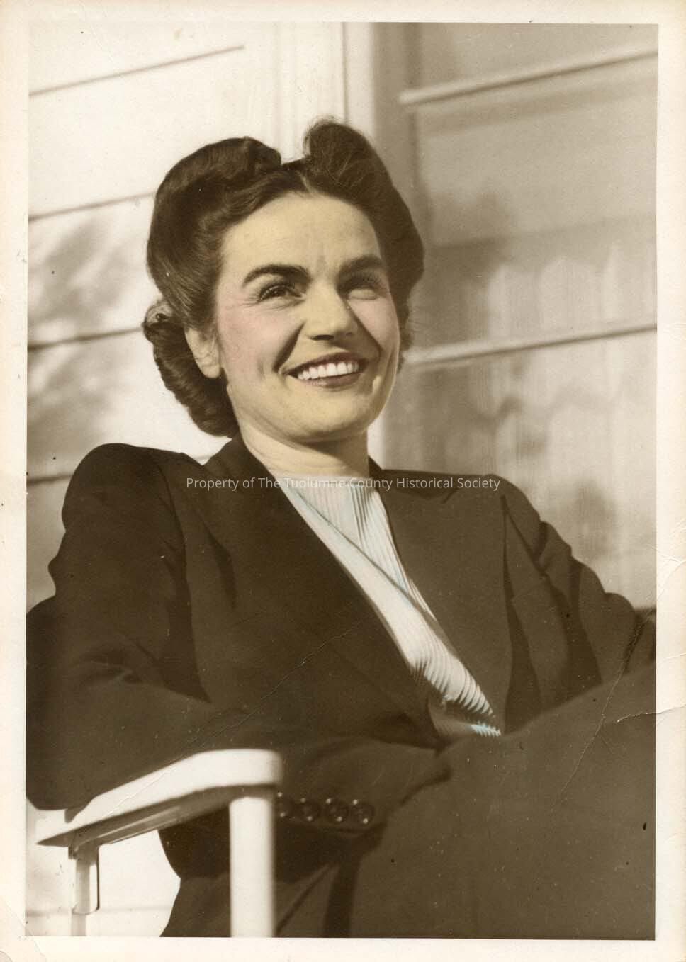 A photo of an unidentified lady sitting chair on porch. Note: Photo from the Mother Lode Art Association Collection. Type: Paper