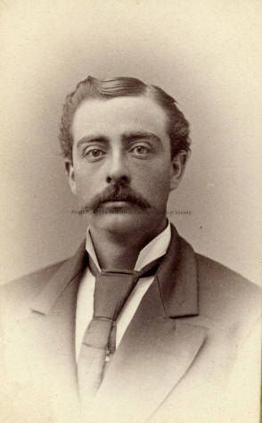 Portrait-Man in a suit with a large tie and has a mustache. Not identified. Part of the Cady Family Album. Type: Paper
