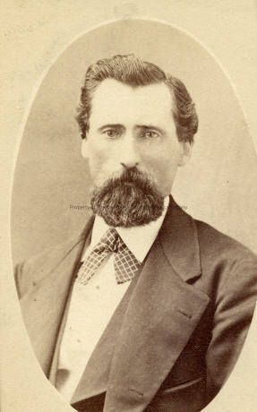 Portrait-Man in a suit with a jacket, vest and a ribbon tie. he has a moustache and beard. Not identified. Part of the Cady Family Album. Type: Paper