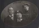 Portrait of man, woman and child. Unidentified. Man has very short hair parted in center, dark jacket, light shirt w/white collar and dark bow tie, clean shaven. Woman has dark hair, dark high necked dress. Child has light hair, large sailor type hat with eagle emblem, dark jacket and light bow at neck.