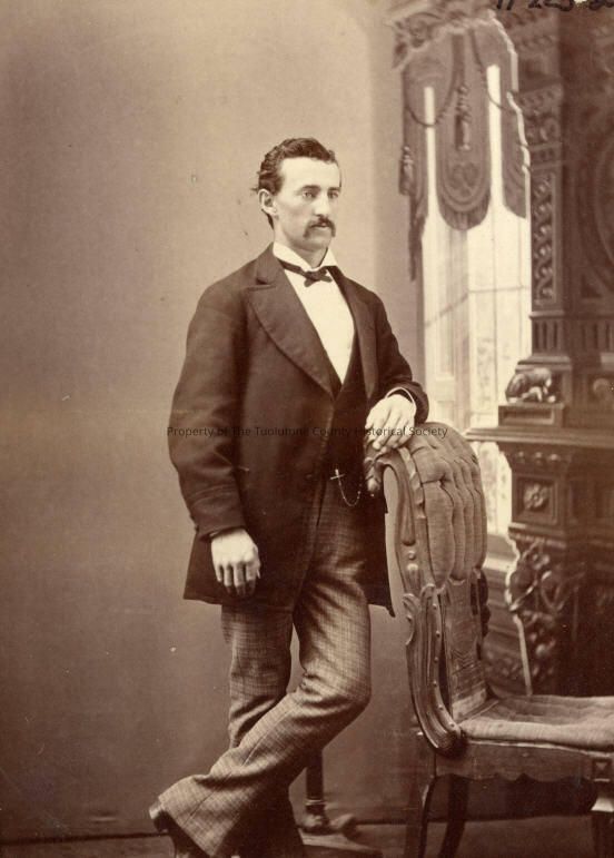 Portrait-Man, Not identified. Standing next to a chair with one arm on top of the chair. There's a fireplace and a window in the back ground. Wearing checked pants, jacket , vest, white shirt and bow tie with a mustache. He has a watch chain attached to the vest.