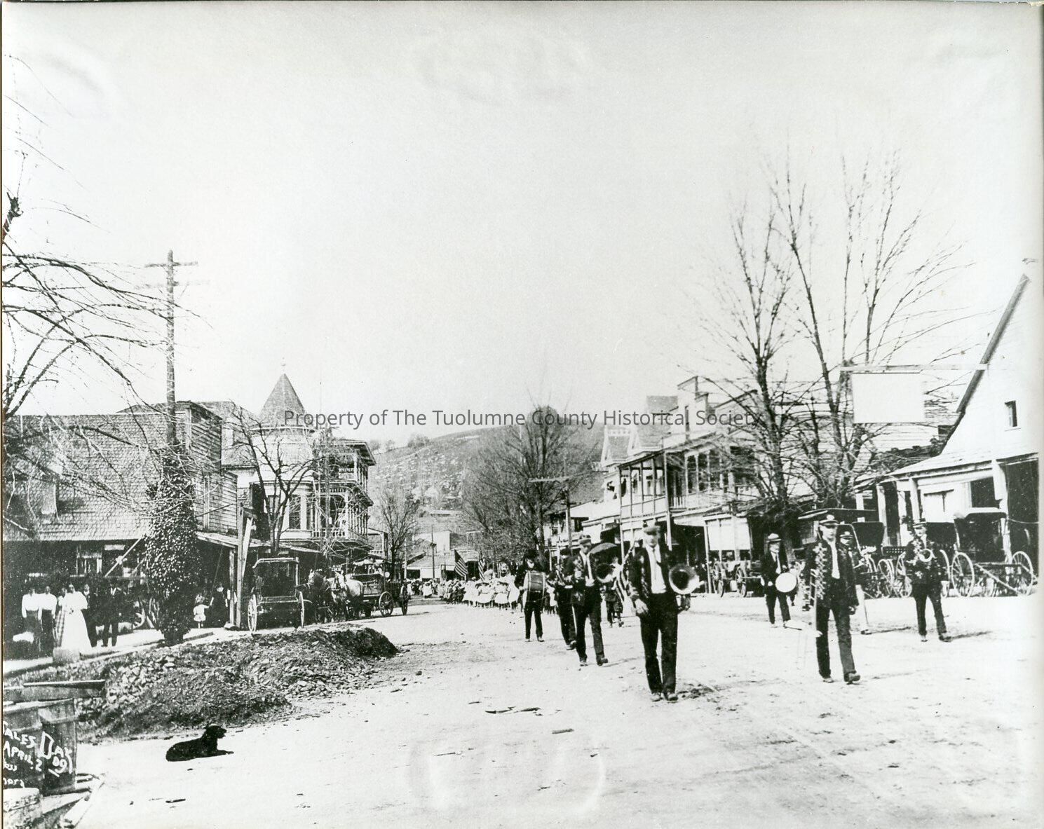 A 8" x 10" Black and white photo of downtown Sonora; parade marching through town.
