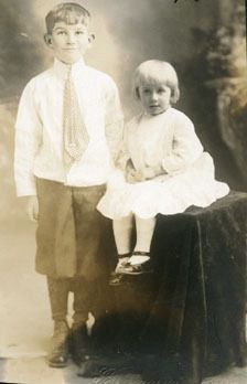 A black and white portrait of an unidentified boy and small girl, not identified. The small girl is sitting on a velvet covered table and the young boy is wearing short pants with shirt and tie and standing beside the table.