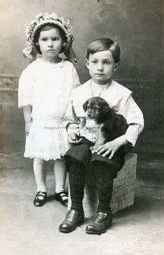 A black and white photo of an unidentified small girl and boy. The boy is sitting on a block of some type and is holding a puppy. The little girl is standing beside the boy and is wearing a white dress with eyelet lace and wearing a hat with flowers and ribbon.