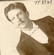 Portrait-Man, not identified. Wearing tuxedo type suit, has short wavy hair and mustache.