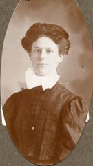 Portrait-Woman, not identified. Wearing dark dress with large white collar, has small hat.