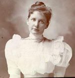 A portrait of an unidentified lady, wearing white dress, high collar, large ruffle around yoke and puff sleeves.