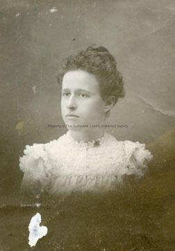 A Black and white portrait of an unidentified woman wearing a dress with lace yoke, dark hair that is worn up. Type: Paper