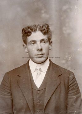 A black and white portrait of an unidentified young man with dark curly hair middle part, wearing three piece suit with shirt and tie. Type: Paper