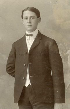 A Black and white portrait of an unidentified young man wearing suit with white vest, black bow tie, standing with right arm behind, dark short hair with middle part.