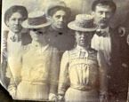 A small black and white photo of two unidentified women wearing straw hats and three unidentified men also wearing hats.