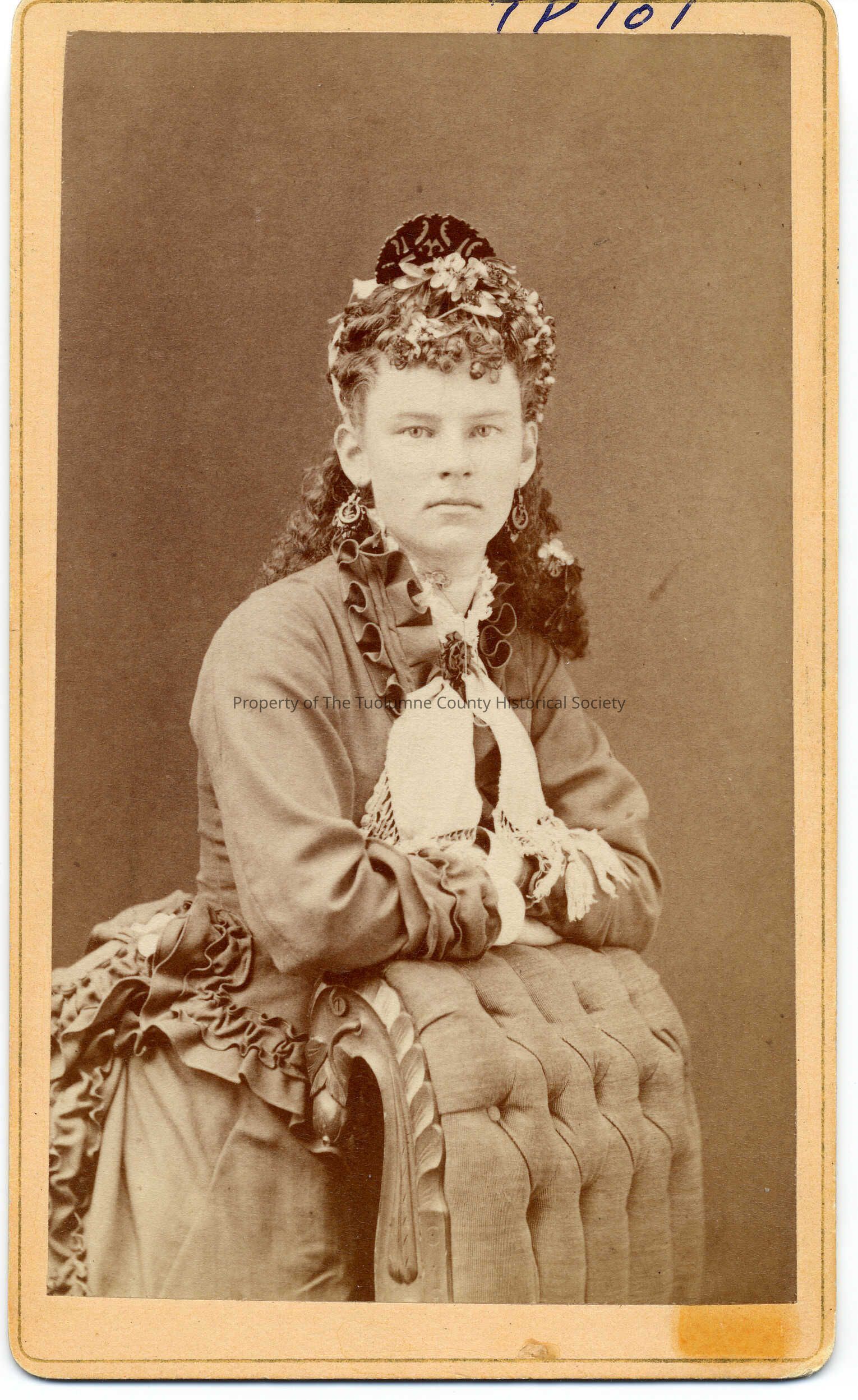 Portrait of unknown young woman standing and leaning on plush chair with her arms crossed on top. Victorian dress and hair comb and flowers in her curly hair that is pulled back. Ruffled collar with bow and earrings.Collection