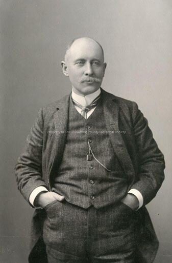 A black and white portrait of an unidentified man wearing three piece suit with watch fob and chain, has a mustache, standing with both hands in pockets.