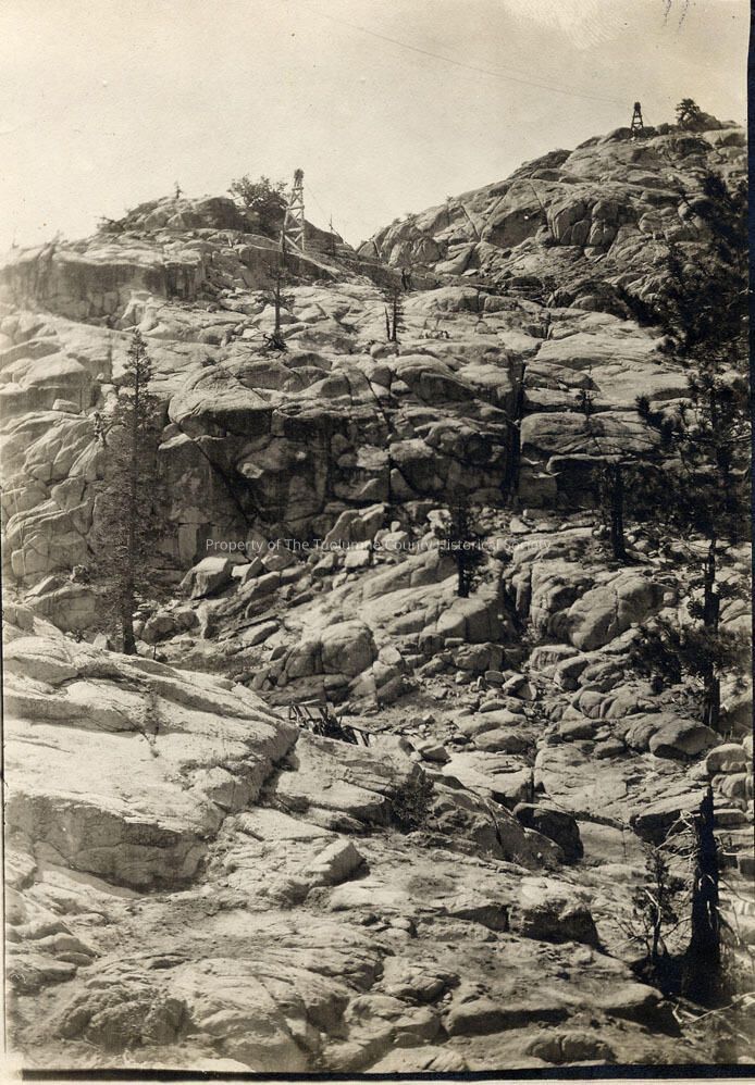 A black and white photo of a granite formation at the Relief Dam site. Work being done by the Union Construction Company, headquarters, Vallecito, Ca. c.1906