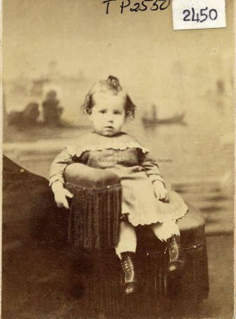 The unidentified child is sitting on a chair. The dress has eyelet around the collar, hem and sleeves.She is wearing pantaloons and high topped shoes