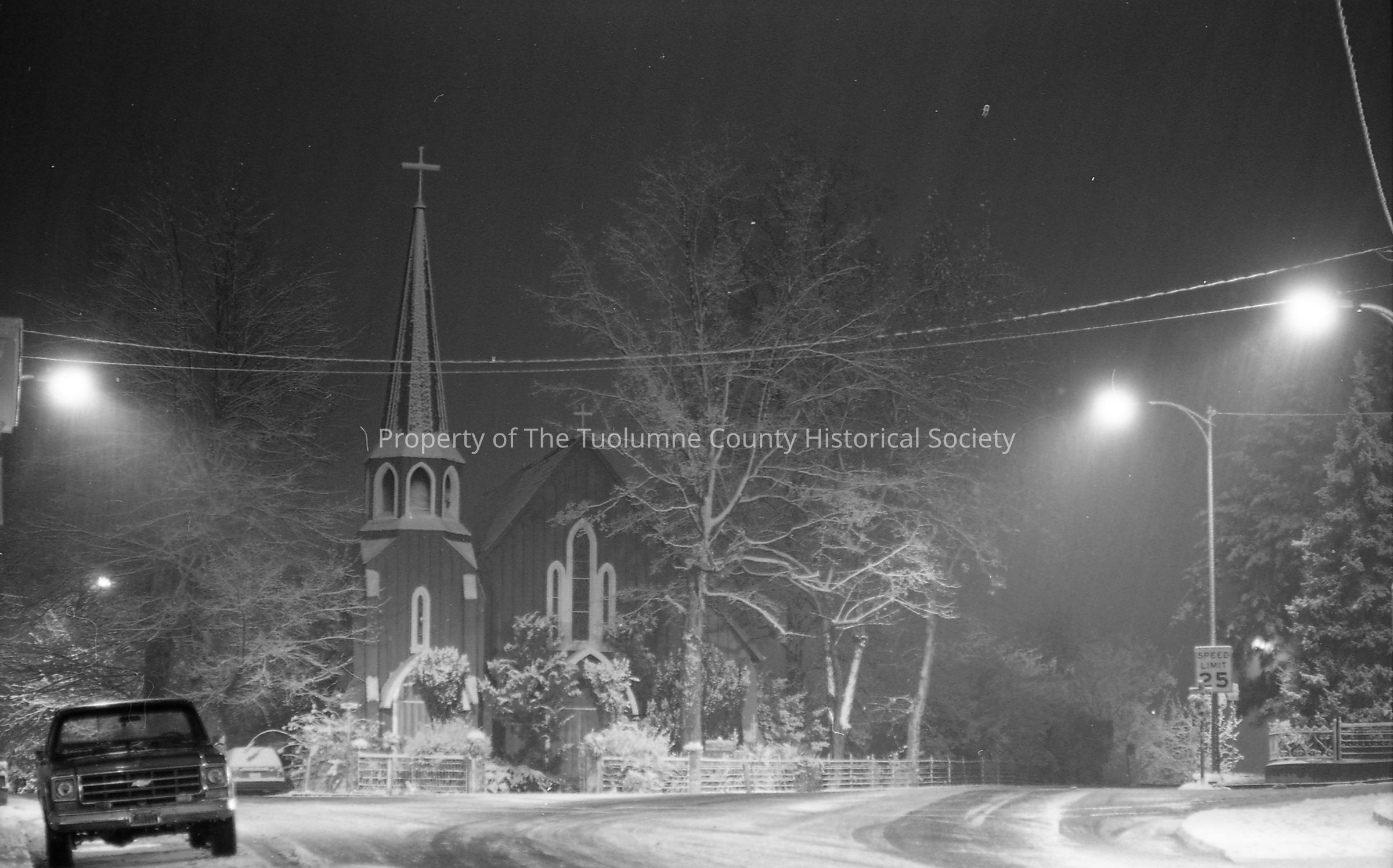 St. James Episcopal Church (Red church) with snow. (2 photos)