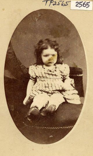 This unidentified child does not look happy. She is siting in a chair wearing a stripped dress with short sleeves and pantaloons. Her long hair is parted in the center.
