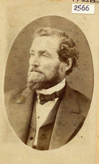 This unidentified man is wearing a suit with vest, dress shirt and bow tie. He has a full beard. His curly hair is parted on the side.