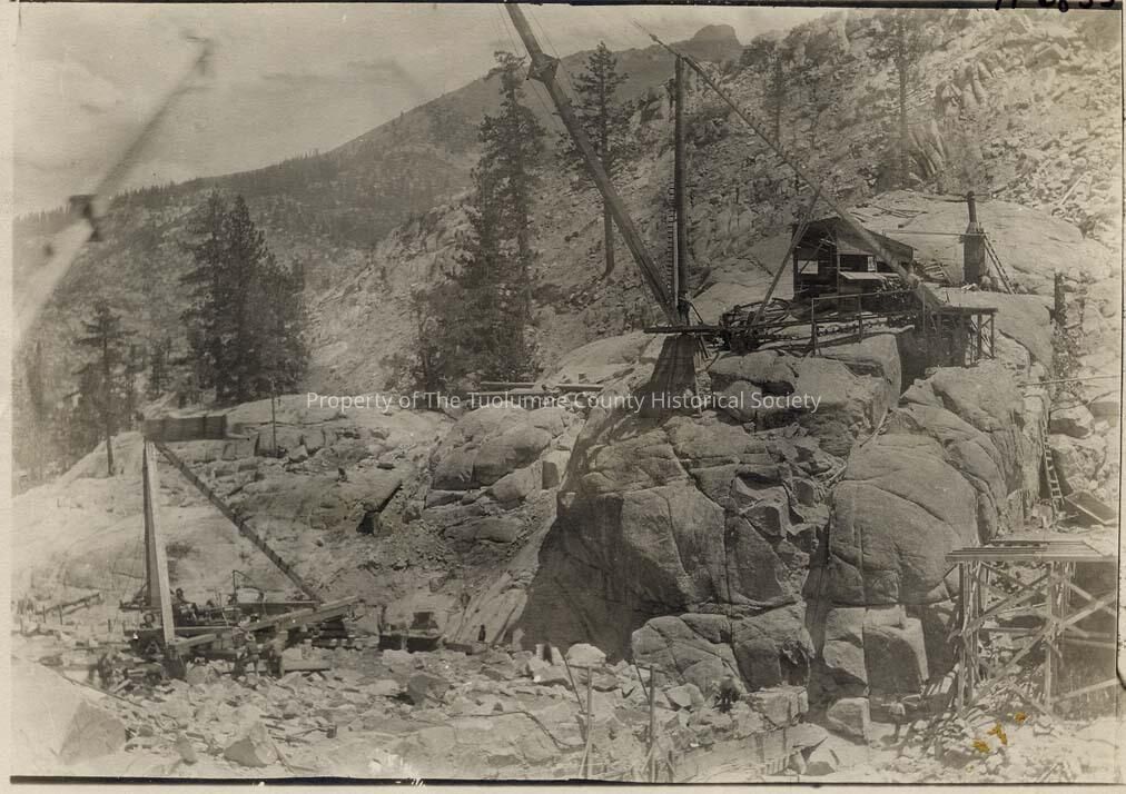 A black and white photo of Relief Dam construction being done by Union Construction Company, Vallecito, Ca. Note the bluff of rocks on which a derrick is placed. This large bluff and yardage was incorporated in the dam which was the reason for curving the face of the dam down stream, which is against engineering principles, however in this case it seemed advisable on account of the great amount of yardage and two side wall connection.