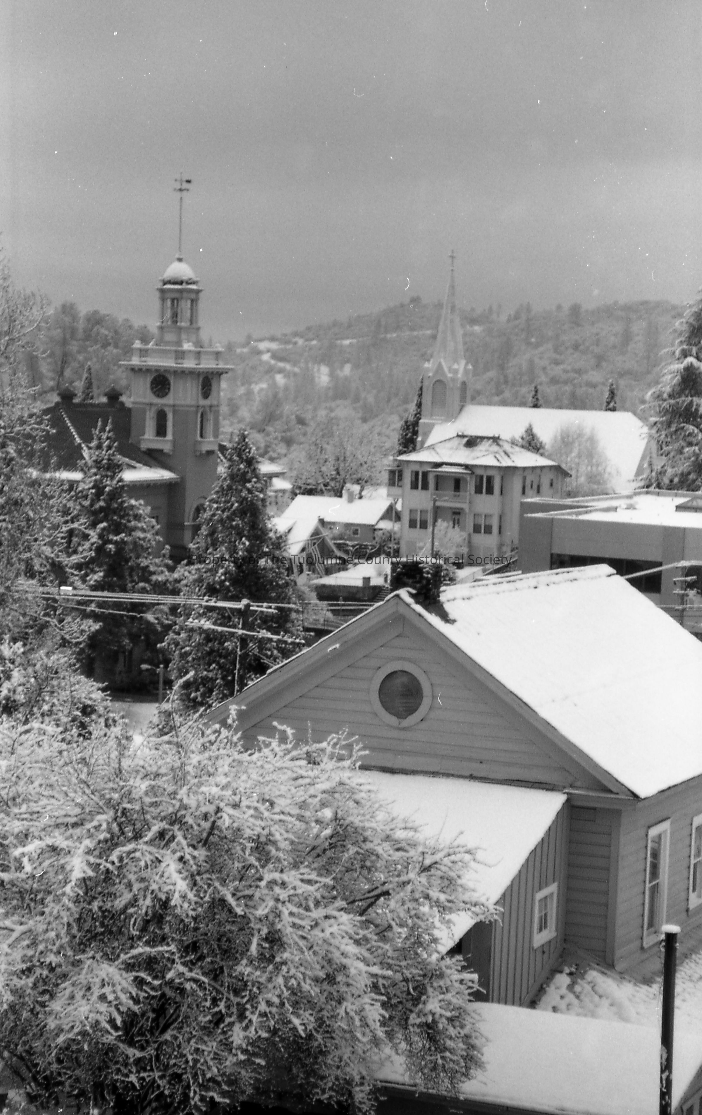 Sonora overview with snow from about 92 N. Shepherd St. Tuolumne County Courthouse, St. Patrick's Catholic Church. (Collection of 6 similar images.)Collection
