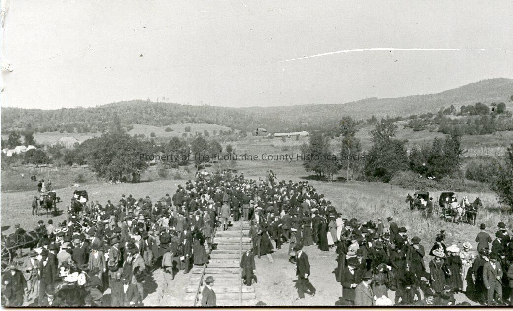 A 4-1/2" x 7-1/2" Black and white photo of a large group of people at the Sierra Railway track laying into Jamestown.