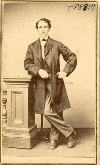 Young man unidentified. Man standing with elbow on post other arm resting on hip. Wearing long dark coat over pants and vest, white shirt and dark bow tie. Short hair parted on right, slightly curly.
