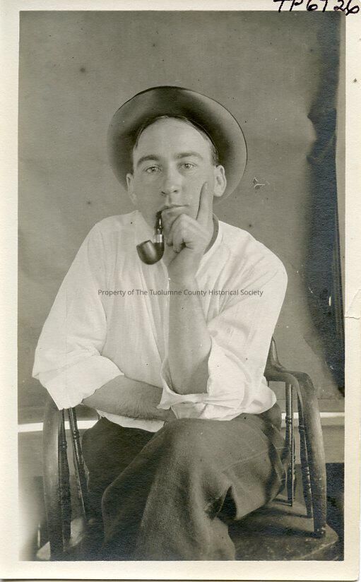 A black and white photo of an unidentified man smoking a pipe,wearing white, shirt and hat. Employee Union Construction Co., Vallecito, Cal. C-1907 No other information available on this photo.
