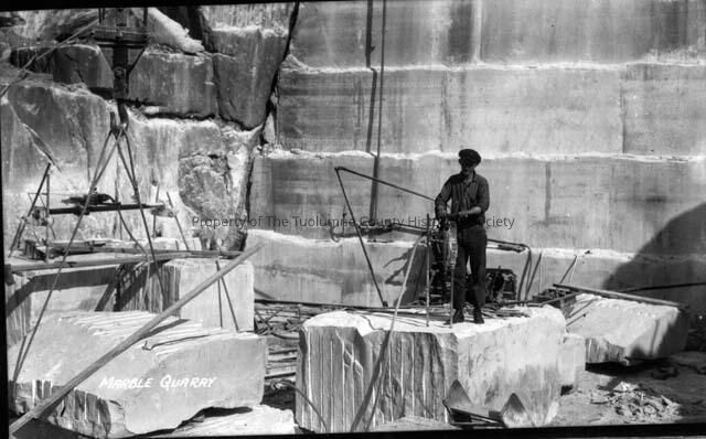 Marble quarry worker surrounded by large blocks of marble in the quarry.