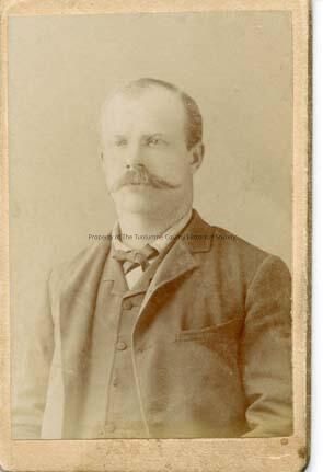 A black and white portrait of an unidentified man wearing a three-piece suit and tie. Has a handlebar-type mustache.