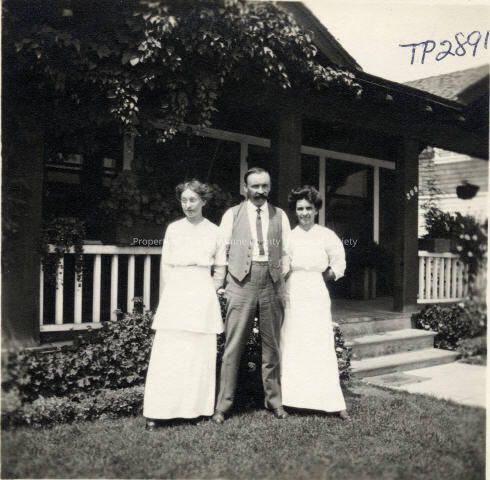 A black and white photo of two (2) women and one (1) unidentified man standing outside residence for photo. No information available on photo. Photo from the Pat Fahey collection.