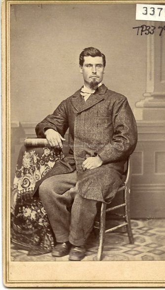 A 3" x 2" Black and white photo of an unidentified man sitting in chair with arm resting on a table with a fringed covering. Type: Paper