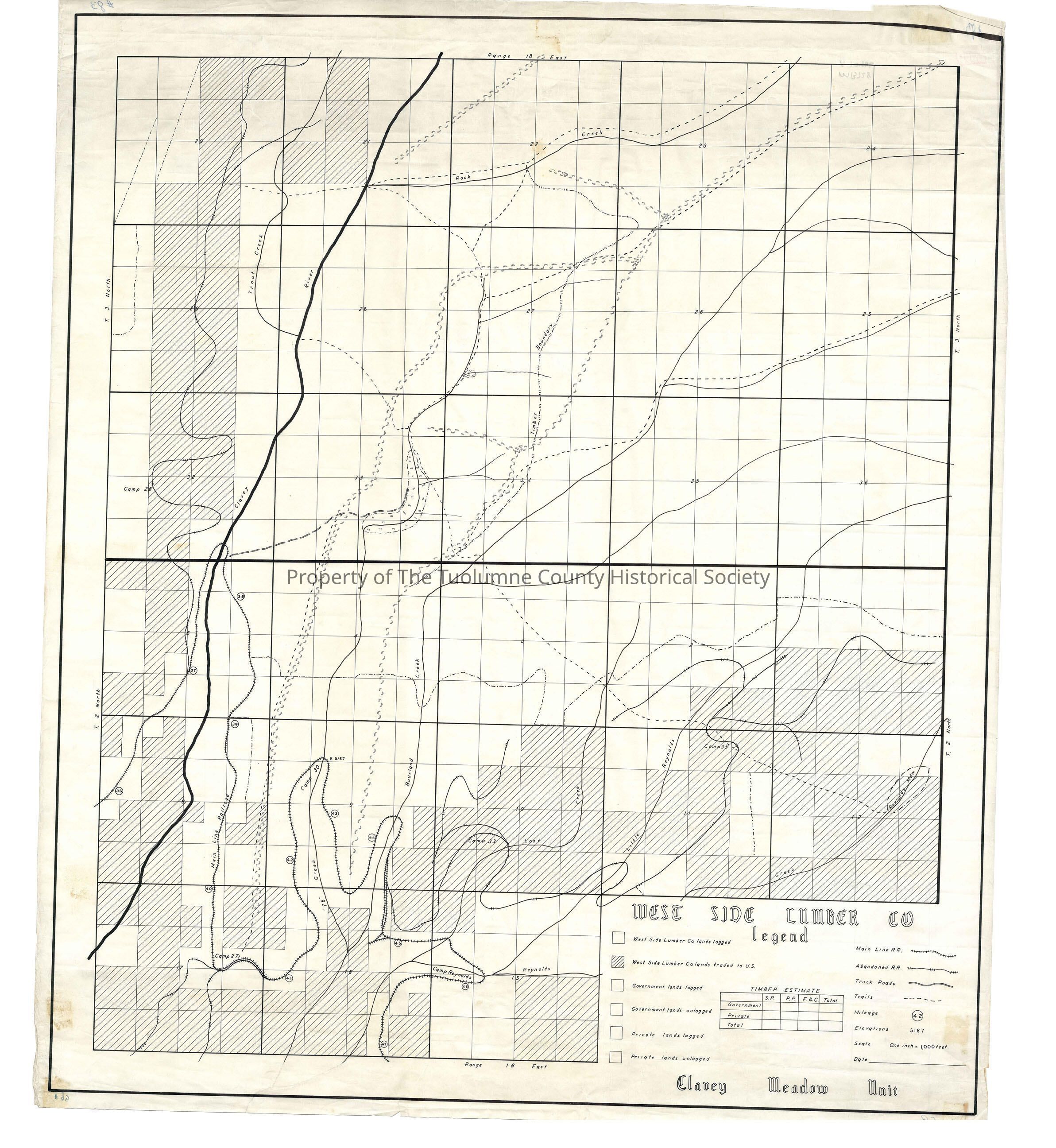 forest/map, logging, railroad, creeks, rivers, West Side Lumber Co Railroad, Clavey River, Rock Creek, Trout Creek, 76 Creek, Bourland Creek, Lost Creek, Reynolds Creek, Big Reynolds Creek, Clavey Meadow Unit, Camp 27, Camp 30, Camp 33, Camp 35