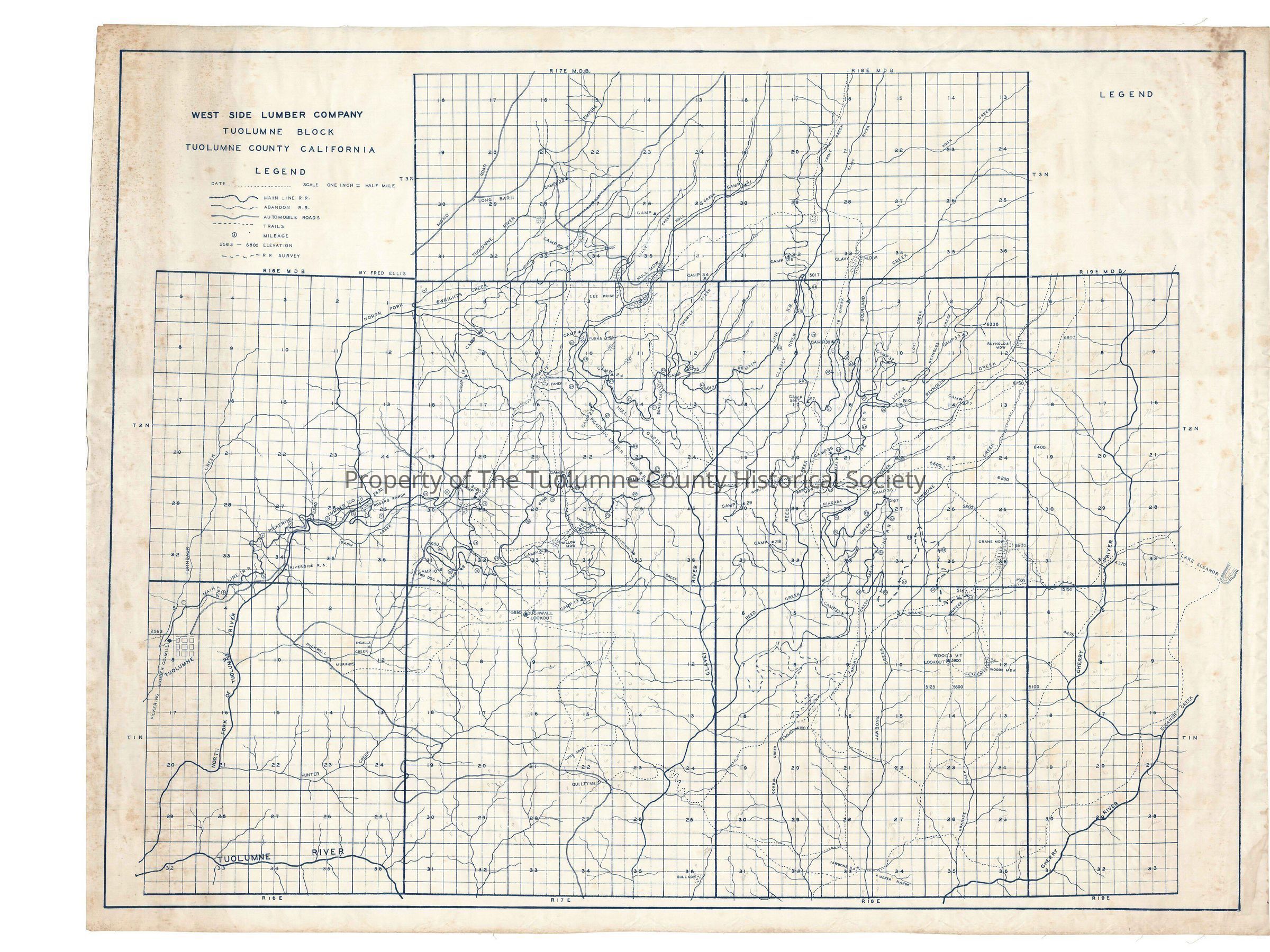 forest/map, streams, rivers, logging, railroad, Hetch Hetchy & Yosemite Valleys Railroad, North Fork of the Tuolumne River, Clavey River, Turnback Creek, Hull Creek, Reed Creek, Reynolds Creek, Jawbone Creek, Cherry Creek, Pickering Lumber Company Railroad, Camp 39, Skunk Creek, Crane Creek