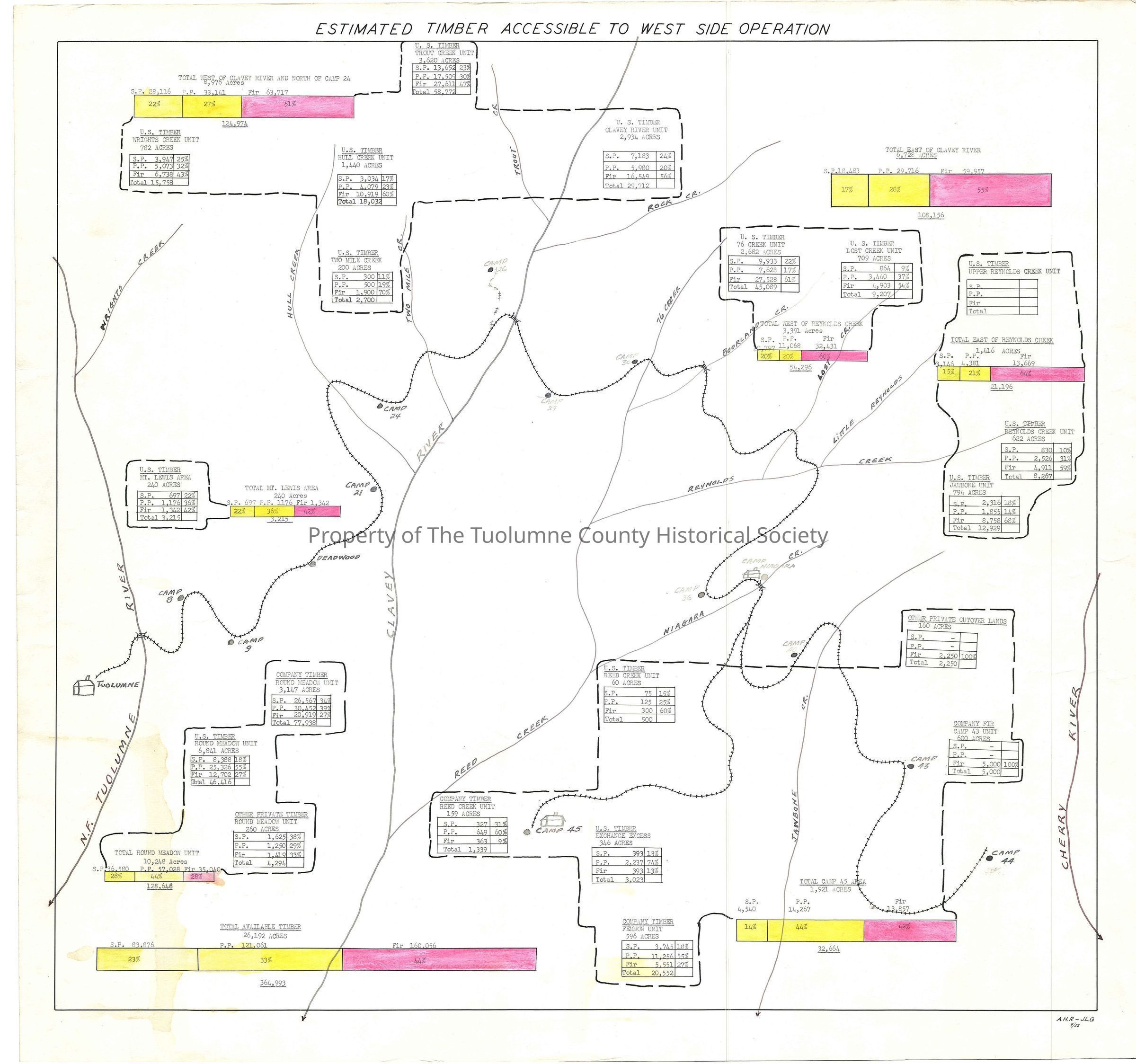 forest map, logging map, railroad map, North Fork of the Tuolumne River, Wrights Creek, Two Mile Creek, Trout Creek, Clavey River, Hull Creek, Rock Creek, 76 Creek, Bourland Creek, Lost Creek, Little Reynolds Creek, Reynolds Creek, Reed Creek, \Niagara Creek, Jawbone Creek, Cherry River, Camp 8, Camp 9, Deadwood, Camp 21, Camp 24, Camp 26, Camp 27, Camp 30, Camp 36, Niagara Camp, Camp 40, Camp 43, Camp 44, Camp 45, Estimated timber accessible to West Side Operation