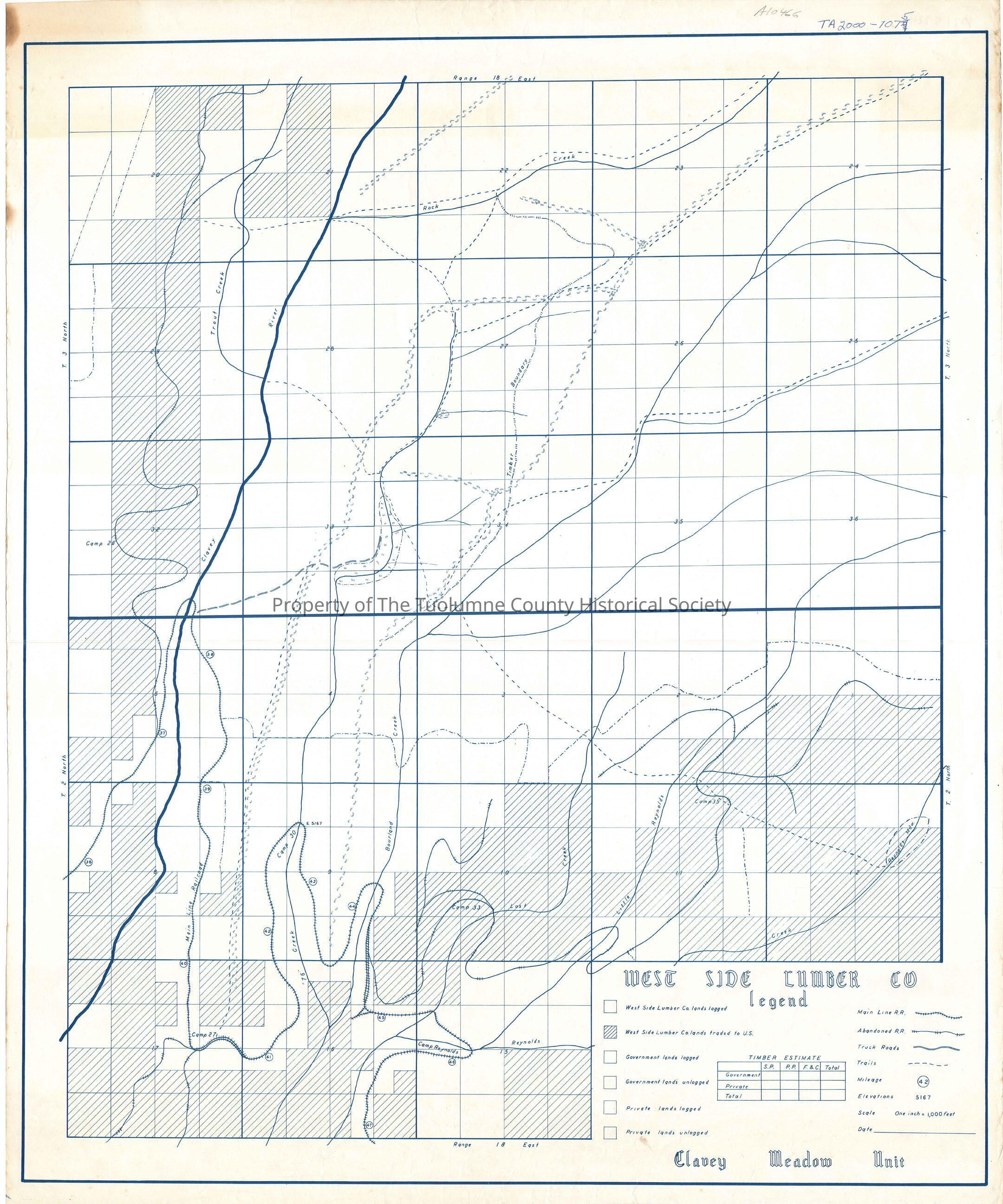 forest map, logging map, railroad map, Clavey Meadow Unit, Rock Creek, Clavey River, Trout Creek, Bourland Creek, Reynolds Creek, 76 Creek, Lost Creek, Little Reynolds Creek, Camp 37, Camp 38, Camp 39, Camp 40, Camp 41, Camp 42, Camp 30, Camp 43, Camp 44, Camp 46 (Camp Reynolds), Camp 47