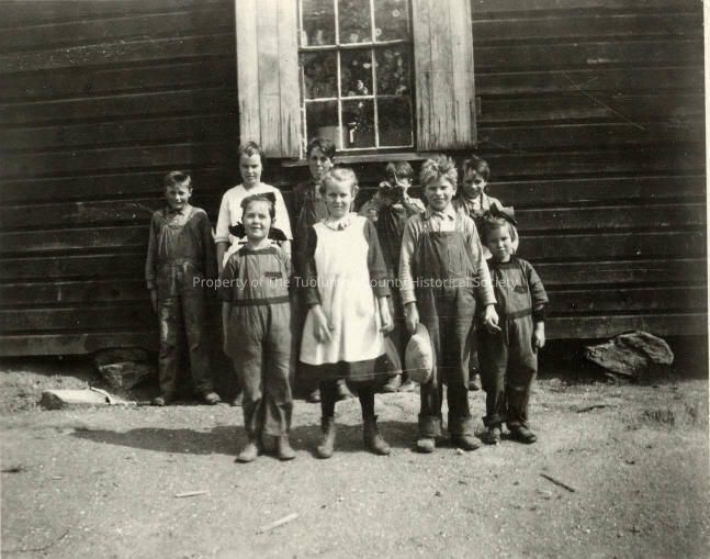 Black and white photo, 3-1/2 x 4-1/4, 8 young boys and girls and 1 young adult woman, standing in 2 rows in front of window in wood building.