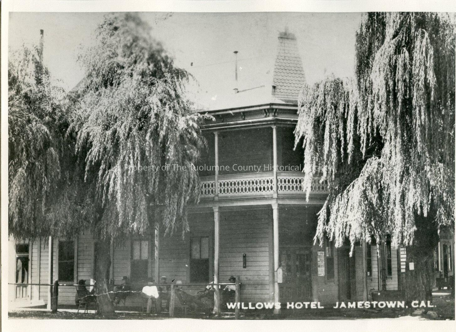 A 8" x 10" Black and white photo of the Willows Hotel in Jamestown, CA. Unidentified men sitting in front. Two large willow trees.