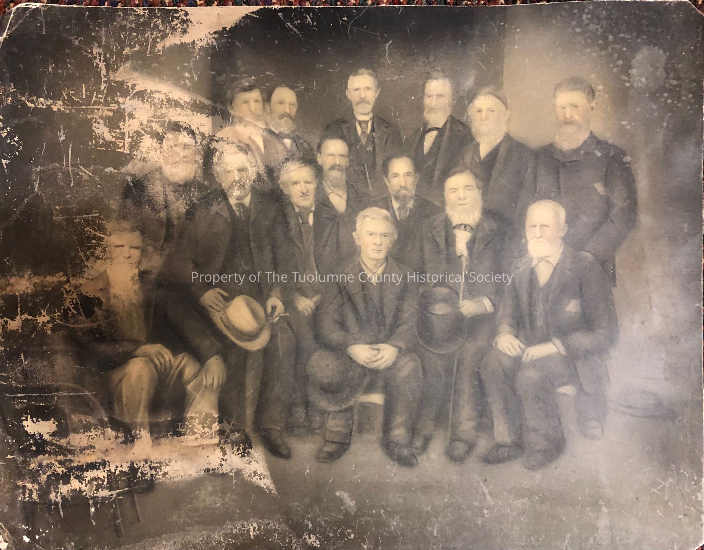 Group of Men. None identified. Found at Woody Carter's house when being renovated, Tuolumne, California. Could be some relatives of his or Tuolumne area Pioneers?Collection