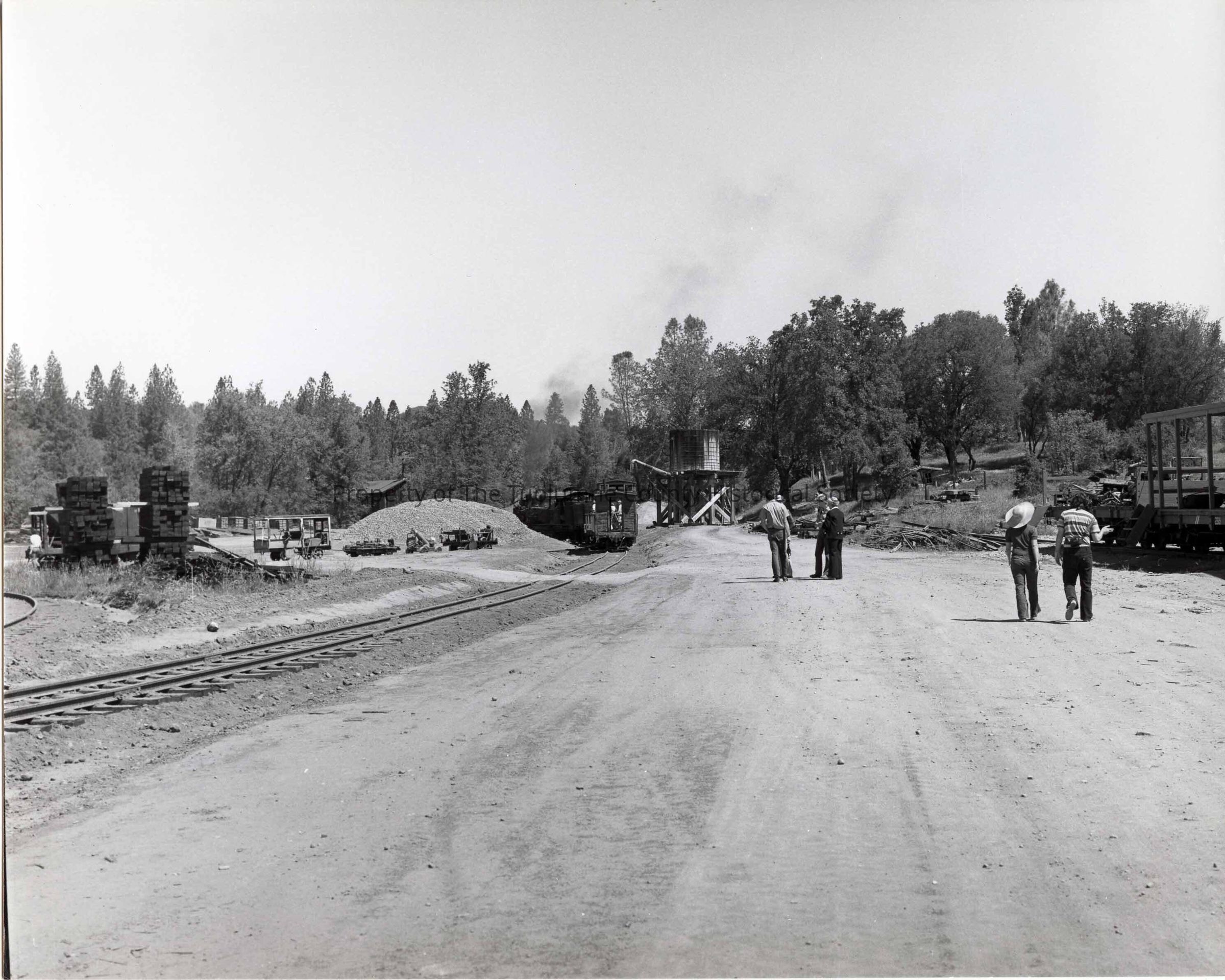 Lost photos. Image shows a train parked by the water tank. There is a large pile of ballast and several stacks of ties. A speeder with trailer is on a siding there At the right edge of the photo is an open air tourist passenger car. Four people are having a discussion in the center, while two others walk towards the open air car. Looks like a review of the project may be happening. One of the four may be Mr Bell?Collection