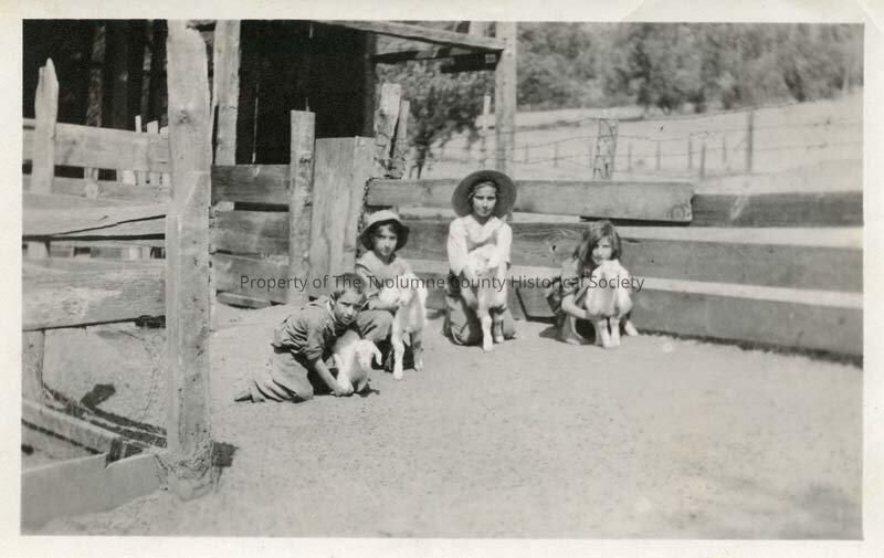 Bonavia Ranch - unidentified children holding a baby goat; 3 girls and 1 boy. Bonavia Ranch, Lyons Bald Mountain Rd.