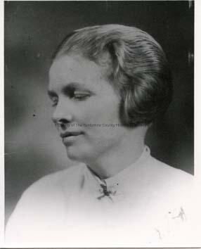 A black and white photo of unidentified lady with light short hair. Wearing with blouse with small ribbon at neck. Type: Paper