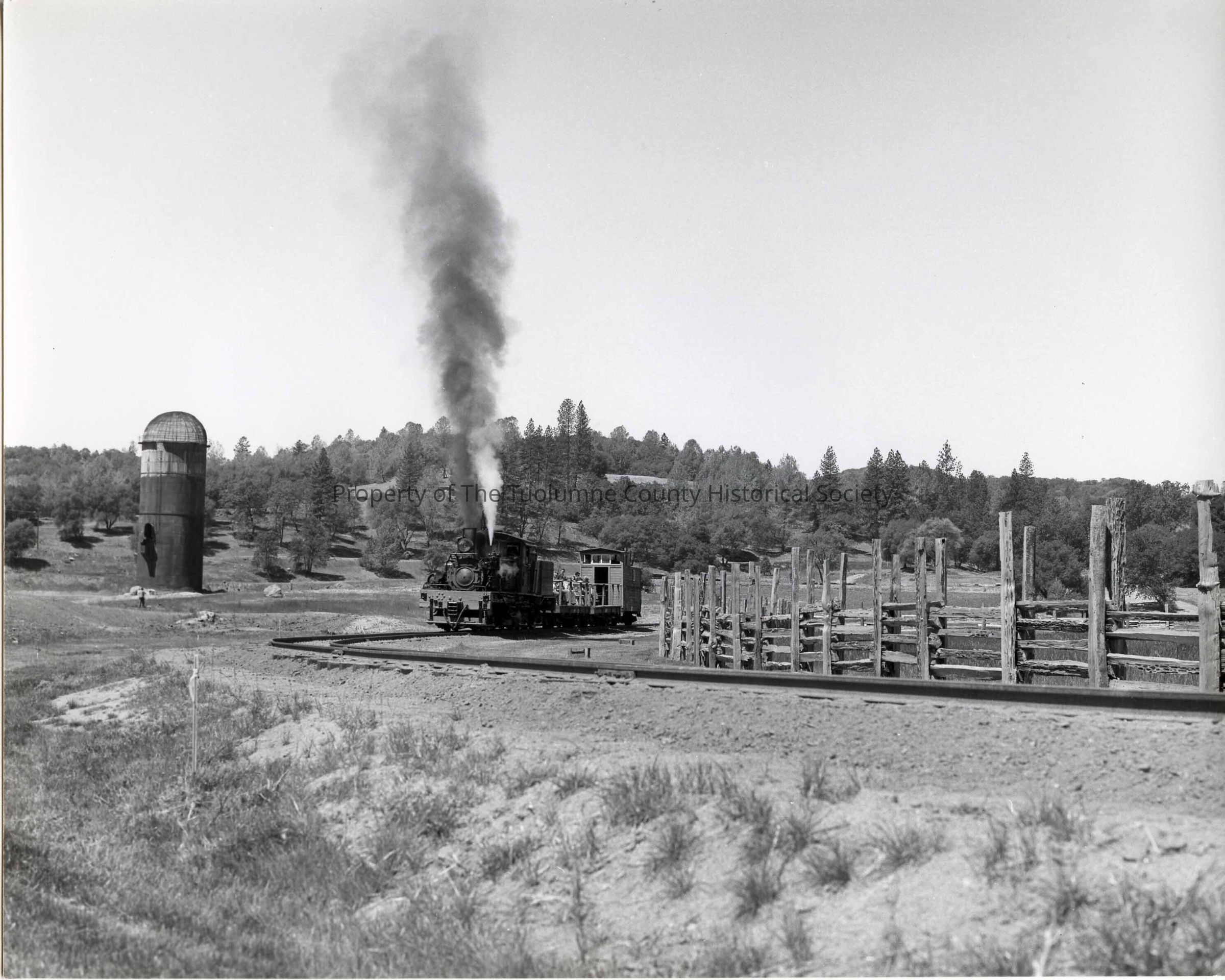 Shay #15 with a tourist train in tow, on the old mill site with the slash burner in the near background. Note the manicured appearance with the rail fence and mowed grass/weeds.Collection