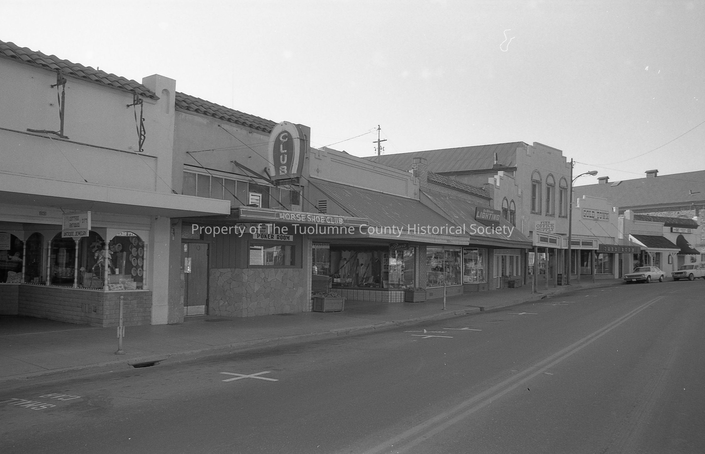 93, 97, 105, 107, 119, 123, 129, 131 S. Washington St. East side. Cottage Antiques (93), Horse Shoe Club (97), Baer's Clothing (105), DaSilva's Lighting (107), Fye's Office Supply (119), Gold Town Card Room (123), 90's club (131).Collection