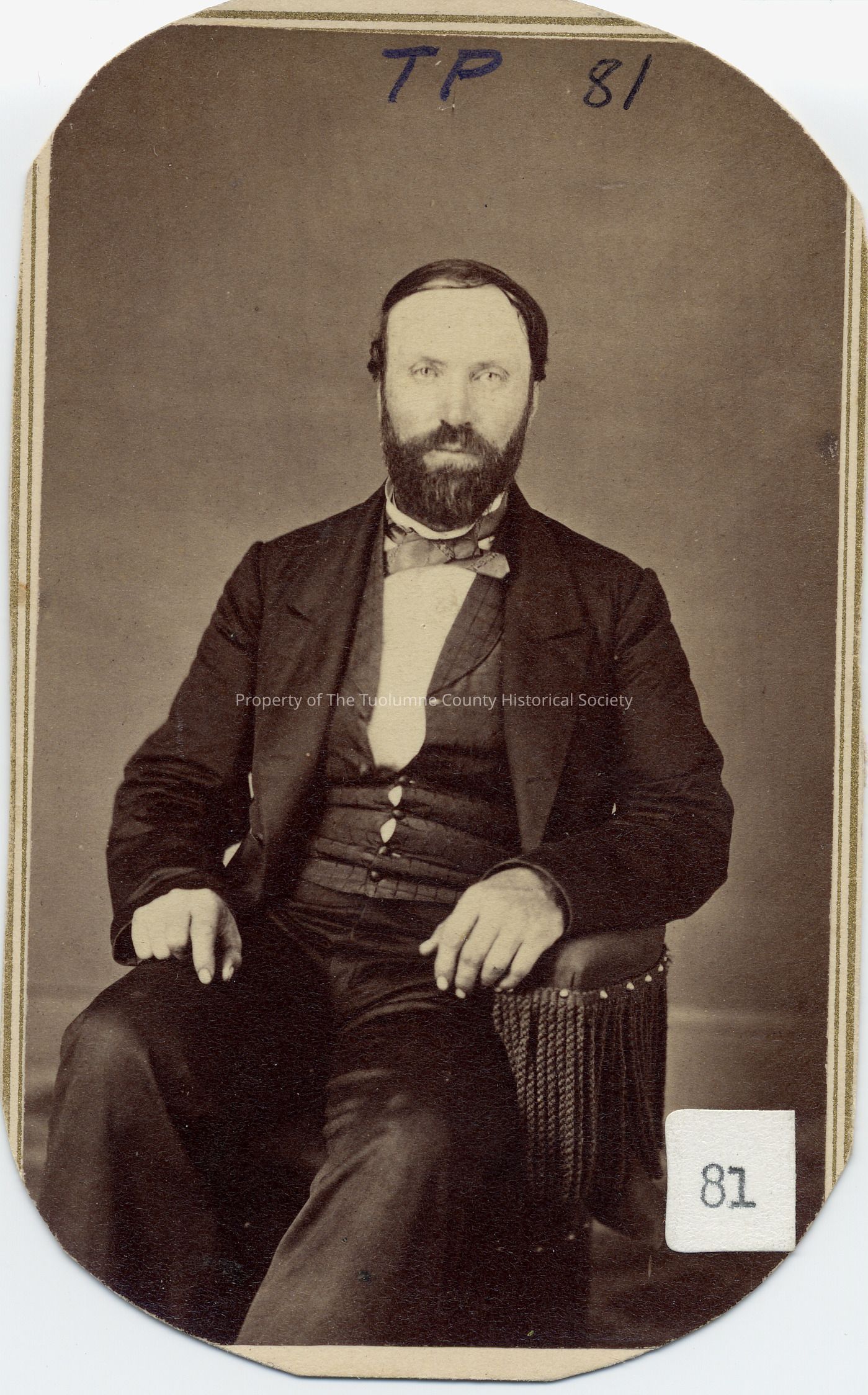 Portrait of unknown man with mustache and beard seated in chair with silk rope fringe, left arm resting on arm of chair.